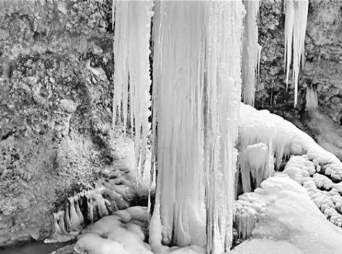 八龙峡的冰,在峰回路转处,趁你不留意,猛然抬头间,就在前面悬崖上,一股冰流,兀自垂下来,和绝壁构成一幅美丽的图画,有道是“三百六十瀑,一瀑一画图。”有的是成片成片的冰挂,像苗族妇女佩戴的银饰,大气庄重、熠熠生辉,如八龙峡的风一般美丽;有的似一股清流喷出山岩却被瞬间冷却,奔腾喷涌的姿势还清晰可见,那清脆迸溅的水滴,涌流在我的心上;有的是一根根像钟乳石的冰柱从岩洞岩窟的顶端垂下来——这些巨大的惊叹号,宛如悲情的歌曲催人流下饱满的泪滴,在阳光下折射出夺目的光彩。谷底一些落尽了叶子的树木,枝条被雾凇裹得亮晶晶的像银条,像玉枝,晶莹透亮,满眼的玉树琼花。落在树上的雪,仿佛融进了树木里,给树的枝干穿上银色的铠甲,把树干都浸染成了白色的。所以冬天的八龙峡,它美得雄伟,美得令人赞叹。