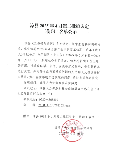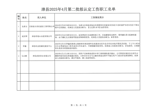 漳县2025年4月第二批拟认定工伤职工名单公示