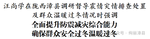 新定西讯 1月3日21时21分,陇西县发生3.9级地震。1月4日上午,市委书记汪尚学深入陇西县、漳县调研督导震情灾情排查处置及群众温暖过冬情况。他强调,要深入学习贯彻党的二十届四中全会精神,全面贯彻落实习近平总书记关于防灾减灾救灾的重要论述,始终坚持以人民为中心的发展思想,树牢底线思维,增强忧患意识,全面提升防震减灾综合能力,确保群众安全过冬、温暖过冬。